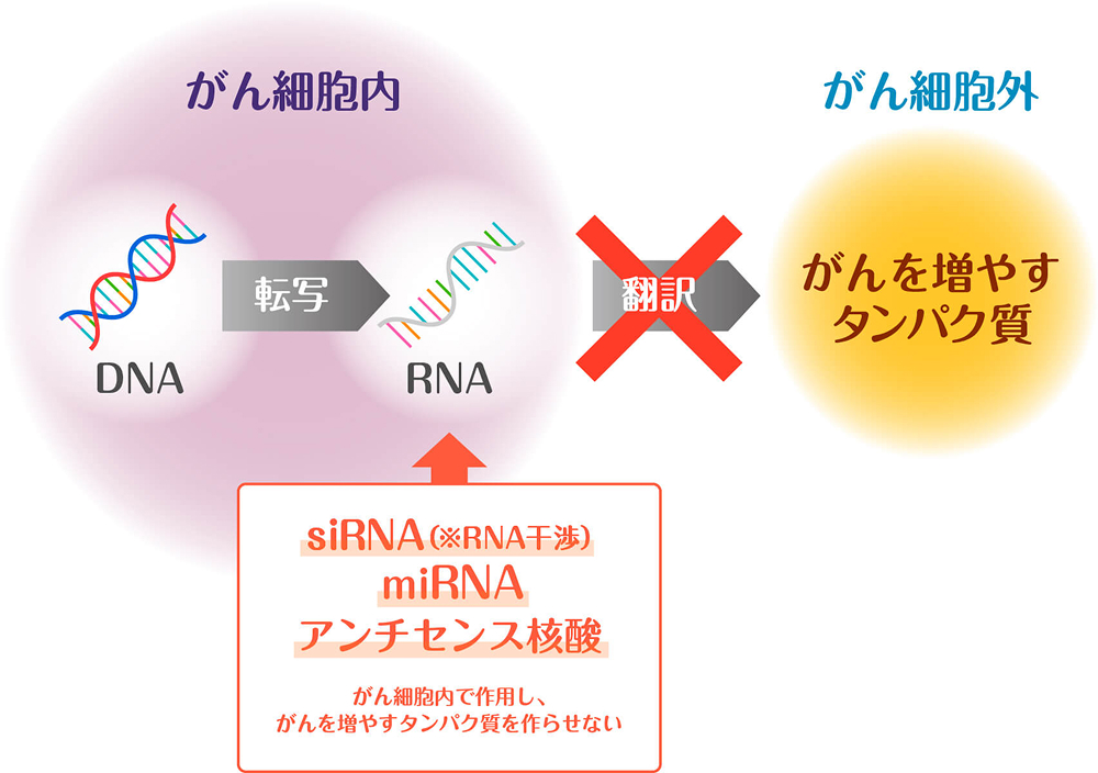 最先端の核酸医薬を用いてがん細胞の内側と外側でがん細胞の増槽をブロックします。